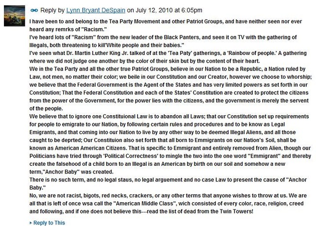 Wow, Lynn Bryant DeSpain is a moron. The NAACP fought against Wilson and his racist segregation policies, and the “entitlements” crap he is talking about is probably a reference to things FDR started, not Wilson. This is what happens when you get history lessons from Glenn Beck and Jonah Goldberg. But “seven babies, seven fathers” is totally not racist! Why do the blacks not like us?
