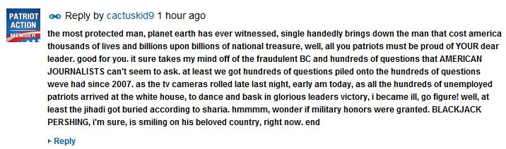 As news of Osama bin Laden’s death reached the world, all of Twitter became a long-running late night talk show monologue as we waited for Obama’s speech officially announcing it. But there are those with no sense of humor, no jaded sarcasm as the world changes around them. They are bitter, they are crazy, and they know that Kenyan Muslim is pulling the wool over their eyes! We go now to Resisnet.com/PatriotActionNetwork…